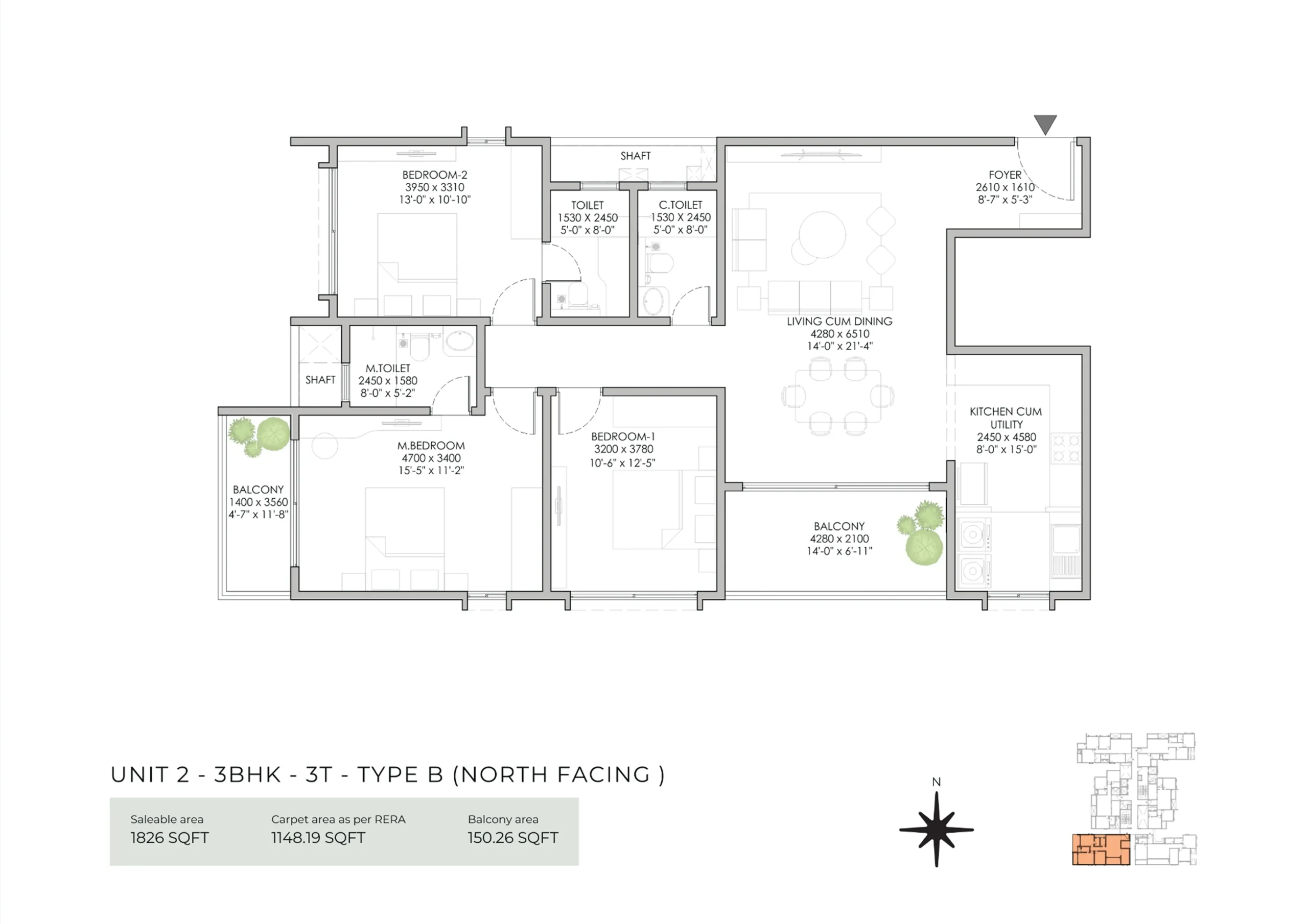 These north-facing units open into a well-defined foyer that creates a private transitional buffer before leading into an expansive living–dining space. This central social zone extends to a generously sized balcony (14’0″–21’0″). The kitchen + utility has easy access from the dining area. Bedroom zoning is thoughtfully planned for improved privacy. The master suite sits privately at one end and includes a balcony. The remaining two bedrooms have efficiently placed bathrooms, one of which directly adjoins a bedroom while the other is accessible from the central passage. Dual balconies, intelligent corridor zoning and the north orientation result in bright, well-ventilated interiors, ideal for homeowners wanting to buy 3 BHK in Bangalore.