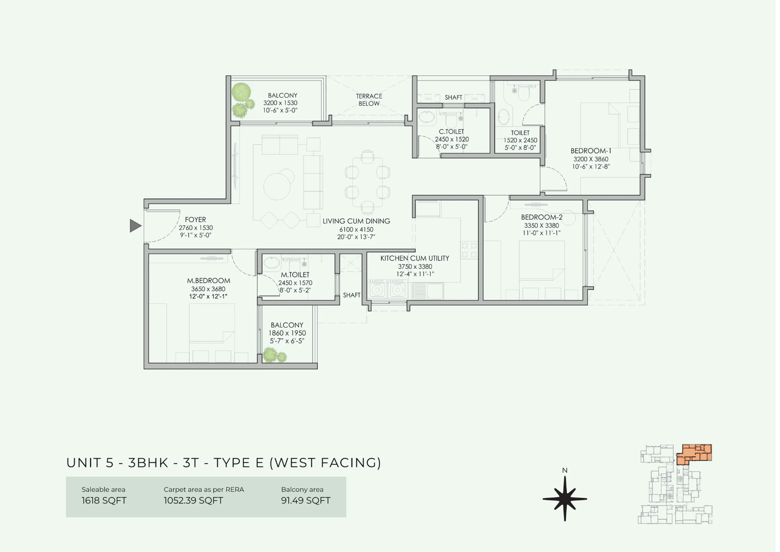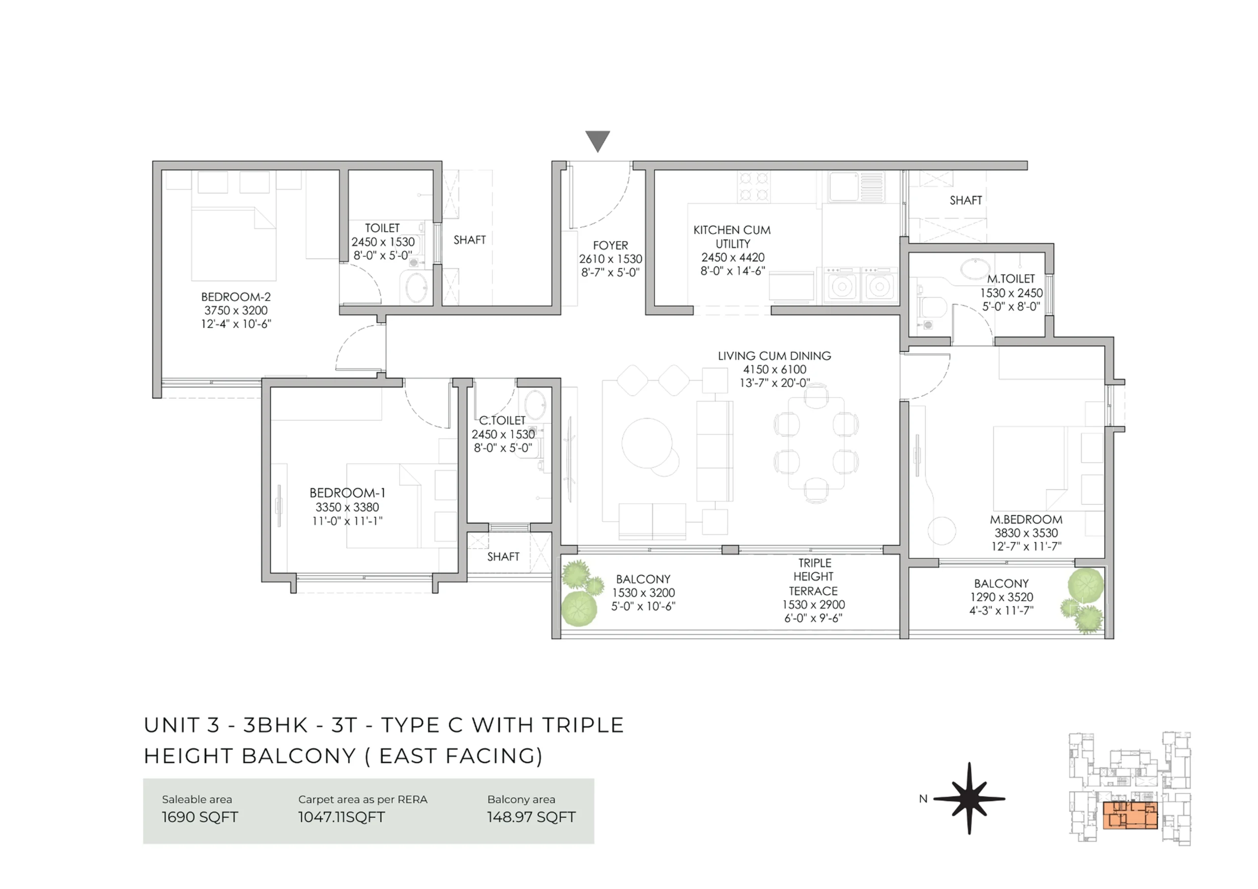 These east-facing 3 BHK layouts open into a foyer before leading into a generously scaled living–dining space. The social zone spills out to a broad balcony running along the living area. The kitchen with attached utility sits conveniently beside the dining space, keeping the wet core compact. All three bedrooms are zoned along a quieter spine, with the master suite anchored at one end for privacy with a balcony. Two additional bedrooms are supported by an attached and a common toilet, making the layout practical for families, guests and work-from-home use. Select units in this typology feature a striking triple-height balcony overlooking the landscape.