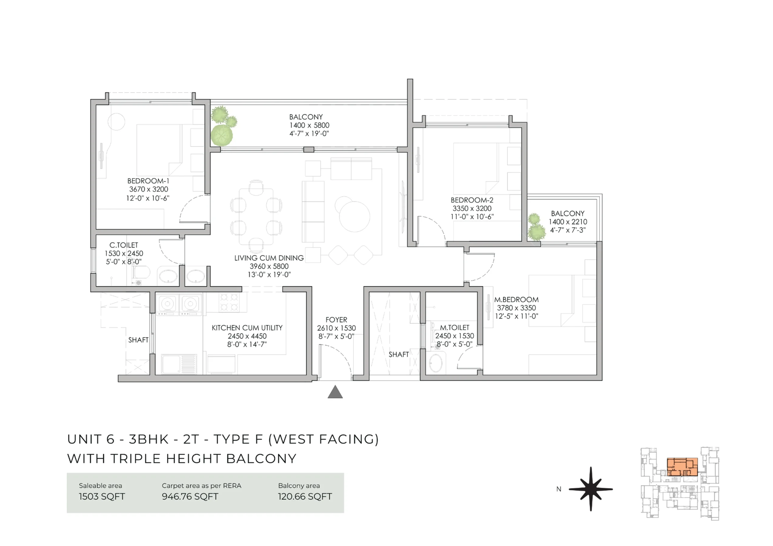 These west-facing 3 BHK units open into a defined foyer that creates a clear transition from the entry to the main living spaces. The living–dining area forms the central social hub of the home and opens to a wide balcony that brings in ample natural light and ventilation. The kitchen with an attached utility sits adjacent to the dining space, ensuring an efficient, compact workflow. The master suite is placed at one end for greater privacy and includes its own balcony. The remaining two bedrooms share access to a common toilet, making the layout functional for families, guests, and have flexible-use rooms like study or WFH spaces. In select units, the primary living balcony is designed as a triple-height volume, enhancing daylighting and cross-ventilation.
